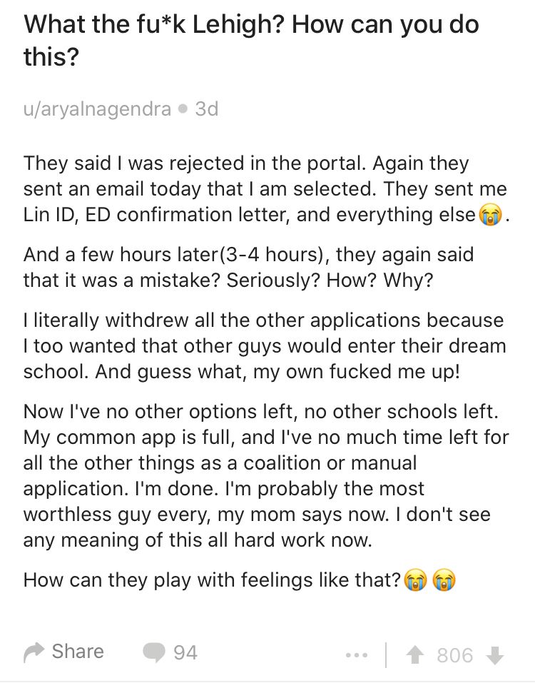 “我在请求端口看到被拒了,然后他们又发来一封我被选取的邮件,ID、确认信什么都发过来了。几个小时之后,他们又发过来一封邮件说他们犯了个过错。我就撤回了对其他校园的请求,我不想占名额,想让其他人也能被梦校选取,没想到我自己的梦校摆了我一道。现在我没有其他挑选了,也没有时刻了,我感觉自己的人生也完了,感觉自己很无用。”