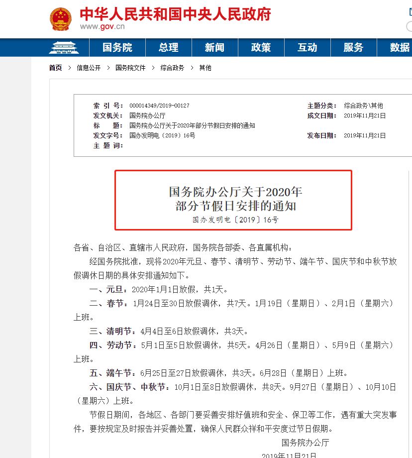 原标题:国务院下发重要告诉:2020年放假日历出来了!国人必看