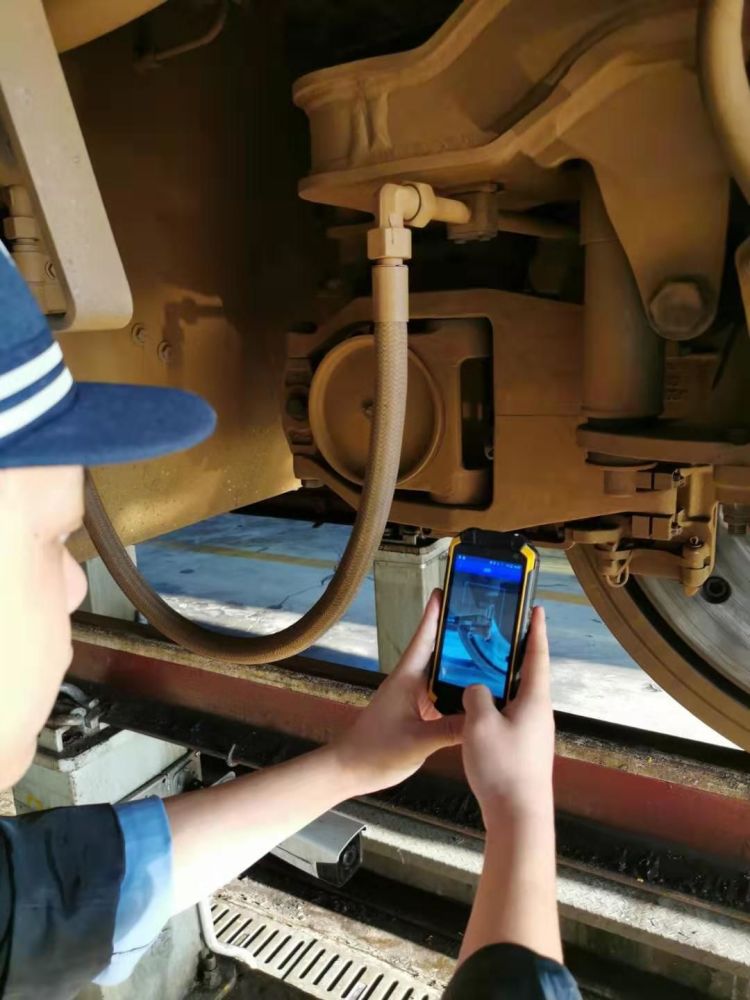 动车组地勤机械师正在运用搭载在手持机上的AI体系复查动车组检修状况。