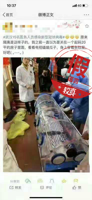 一张关于肺炎阻隔的截图在网上疯传,图片中疑似肺炎患者被关在玻璃设备内,周围有全副武装的医护人员,有人说这才是阻隔的真实姿态。