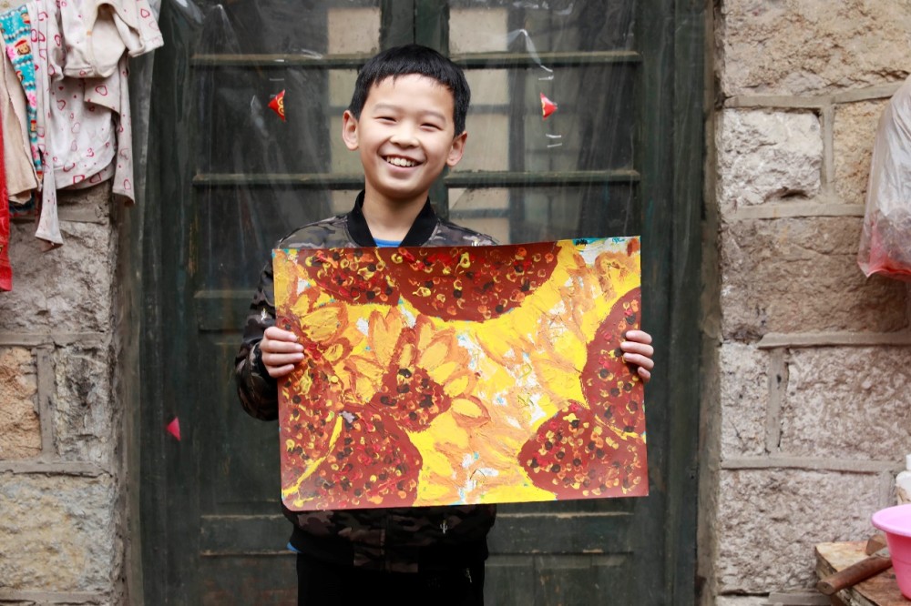 图片中这个笑脸绚烂,举着“向日葵”画作的小男孩叫做高相宇,他因这幅讲堂画作被教师赞称为“小梵高”。相宇身世凄惨,自幼爸爸妈妈双亡,由爷爷奶奶抚育长大,可是他不觉阴霾,表面英俊阳光,心里温暖仁慈。