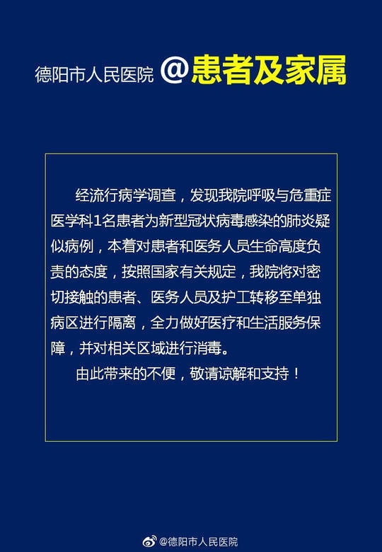 1月31日清晨,四川德阳市人民医院发布音讯,经流行病学查询,发现该院呼吸与危重症医学科1名患者为新式冠状病毒感染的肺炎疑似病例,本着对患者和医务人员生命高度负责的情绪,依照国家有关法律法规,该院将对密切接触的患者、医务人员及护工转移至独自病区进行阻隔,全力做好医疗和生活服务保证,并对相关区域进行消毒。