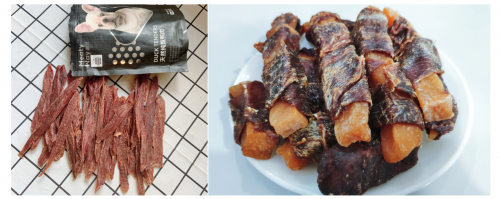 上图为天然纯甄鸭肉口味的Meaty Way爵宴。能够正常的看到,鸭肉的色彩显着比咱们平常给狗狗吃的鸡肉干零食要深许多。由于鸭胸肉含有很高的肌球蛋白,越是朴实的鸭肉其色彩越深,Meaty Way爵宴的产品出现落落大方的红褐色,可见其质料优质且制造进程天然。