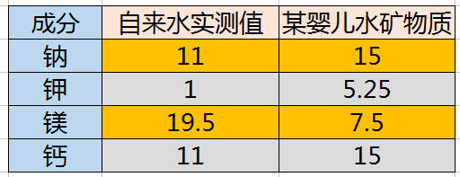 (补白:自来水实测值数据源自guokr.com,北京某居民小区;某婴儿水矿物质源自某产品标示的上约束核算而来。)