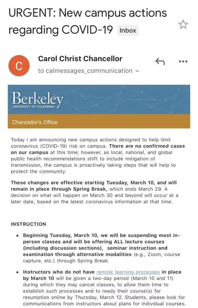 加州大学伯克利分校日前宣告现场教育将在本周二(昨日)起暂停授课,停课将一向继续到春假的最终一天3月29日。校方将依据停课这几周的动态来决议下一步的动作,并且评论和评价讲座课程和研讨会以其他的方式举办。