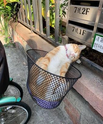 这只让两个小孩挂在心上的猫咪叫阿橘,原本是楼下的漂泊猫。半年前,常常躲在主人的自行车车筐里歇息。