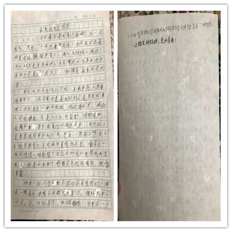 孩子的著作中有一件特别的“著作”——《最美的短发姐姐》,来自一名叫冯研轩的同学。“让我形象最深的仍是在天坛医院作业的李百一护理姐姐,她及腰长发,换患者安全健康。由于短头发更能确保安全和卫生,李百一想都不想就让辛枫教师剪了平常分外珍惜的头发。”冯研轩写道,“作为一名小学生,我不能像哥哥姐姐们相同去一线斗争,但我能做到的是,做好防护不外出,好好学习活跃训练……”在信纸的反面,冯研轩还专门写道:“把我用压岁钱买的发卡送给李百一姐姐。让短发的姐姐,愈加美丽!”