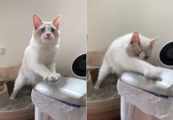 这只愚笨的布偶猫名叫屁屁,从两个月大的时分,现已来到了主人的家里。惋惜的是,五个月过去了,它一次都没有成功地自己着手埋屎。每次不是在抓地板,便是抓近邻的垃圾桶。更为奇特的是,屁屁在抓垃圾桶的时分,还会回头闻一下,是否还有滋味漏出来。在发现还能闻到自己便便气味的情况下,它就会愈加用力地抓垃圾桶,期望有时机能够埋掉自己的气味。