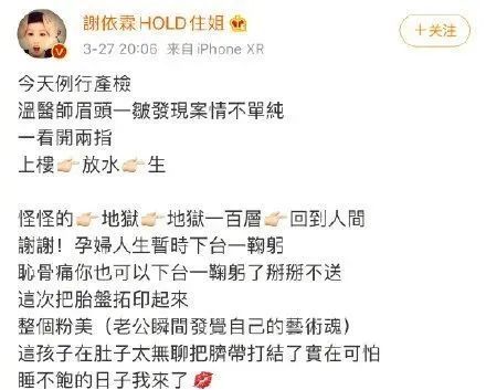 3月27日晚,谢依霖发微博共享今日二胎喜讯,并晒出了夫妻二人抱着重生婴儿一起沐浴的相片,画面十分温馨。