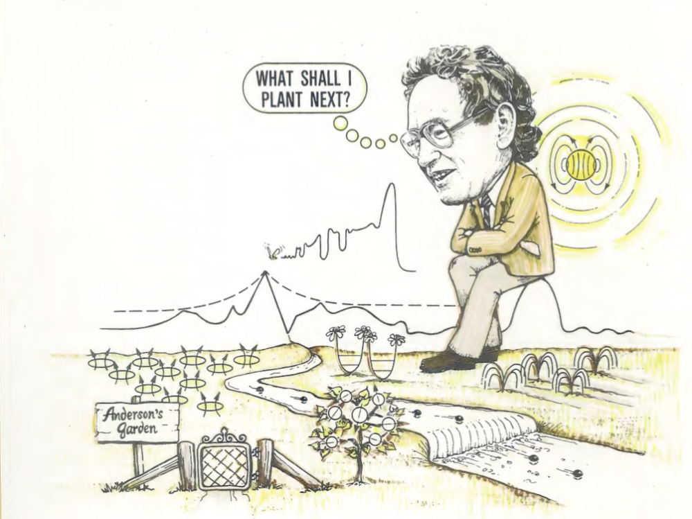 在普林斯顿大学物理系 Phuan Ong 教授的办公室墙上,贴着一幅趣味盎然的卡通画。画中的安德森教授正笑脸可鞠地坐在花园内的 “小山” 上,俯视着园内的奇树异草,脑子里想着 “What shall I plant next?”,(下面该给俺的园子添点啥?)