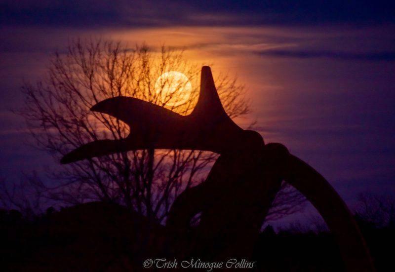 上图为2019年2月19日,特里什·米洛·柯林斯拍照上一年度最大超级月亮,观星雕塑背面是升起的月亮。马诺维尔户外,纽约。